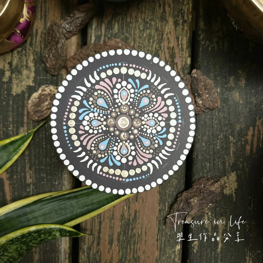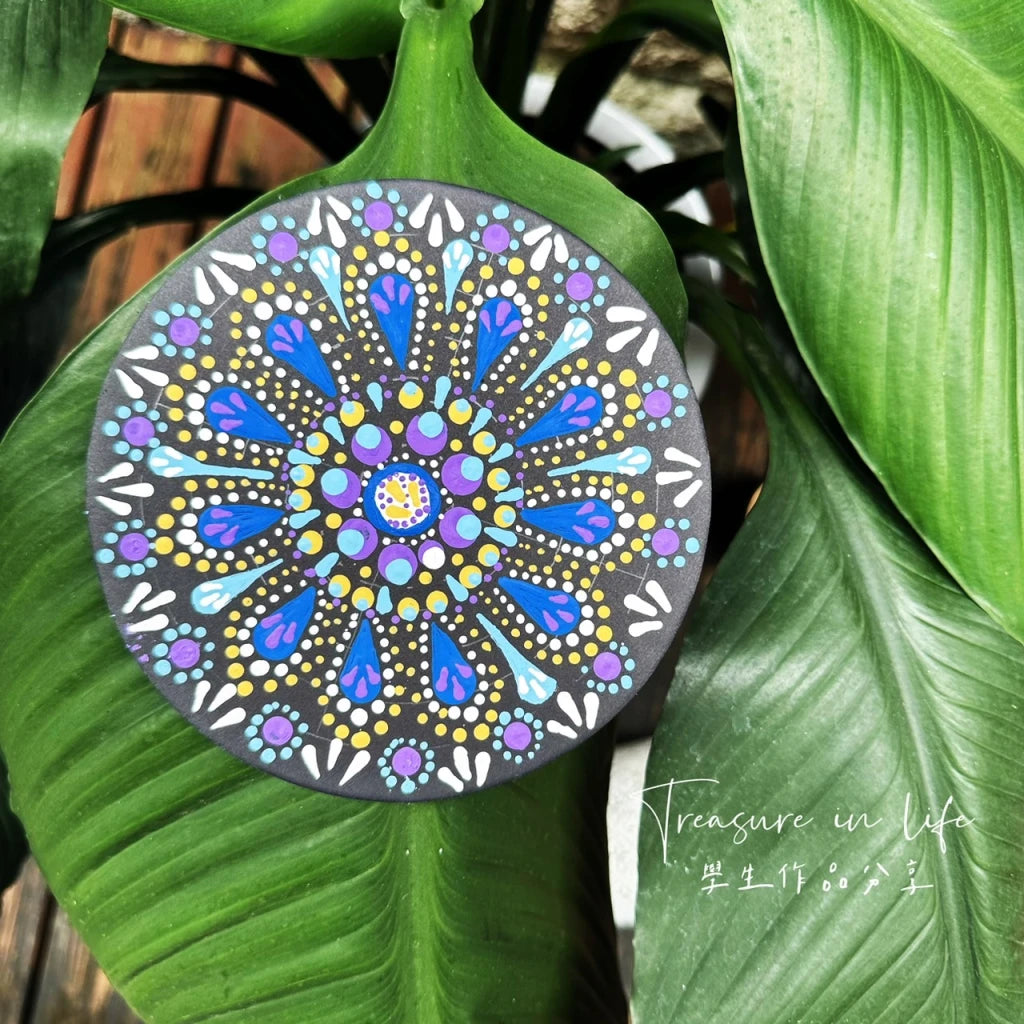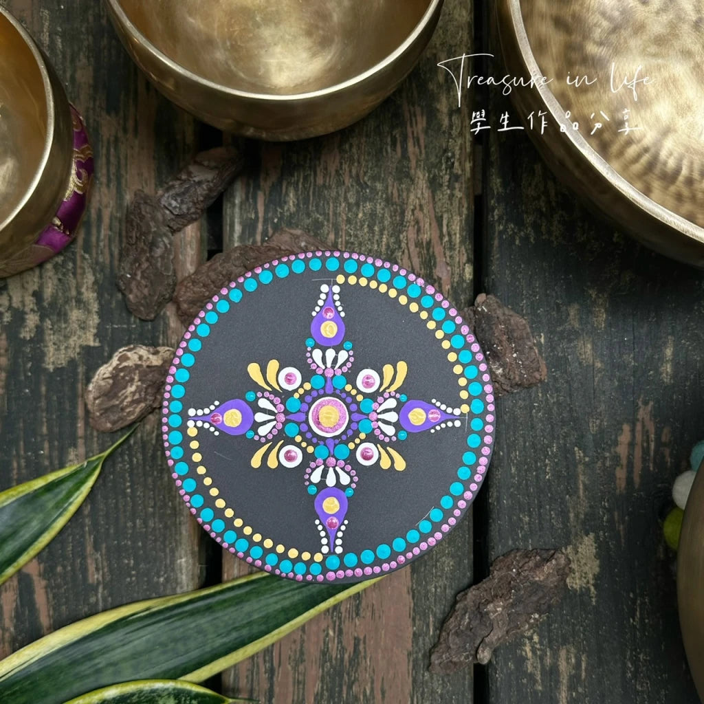 課程會帶入頌缽冥想,帶領學生靜心與身體連結,將感受的一切透過曼陀羅的繪畫方式釋放出來,進而達到舒壓、療癒之狀態。